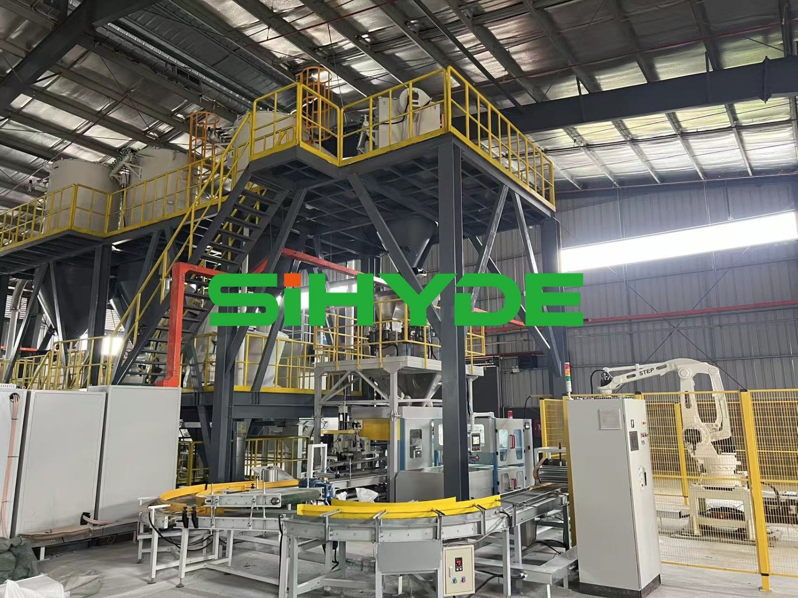 原料经全自动拆包→负压输送→储料仓储存→精准称量→仓泵输送→全自动包装→成品整形→机器人码垛,全程由 PLC 集中控制,实现无人化、密闭化、高精度自动化生产。![]()